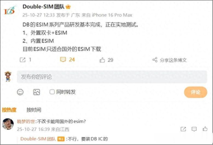 2025年10月27日,Double-SIM团队发文表示:DB的eSIM系列产品研发基本完成,正在实地测试,1、外置双卡+ESIM;2、内置ESIM,目前ESIM只适合国外的ESIM下载。